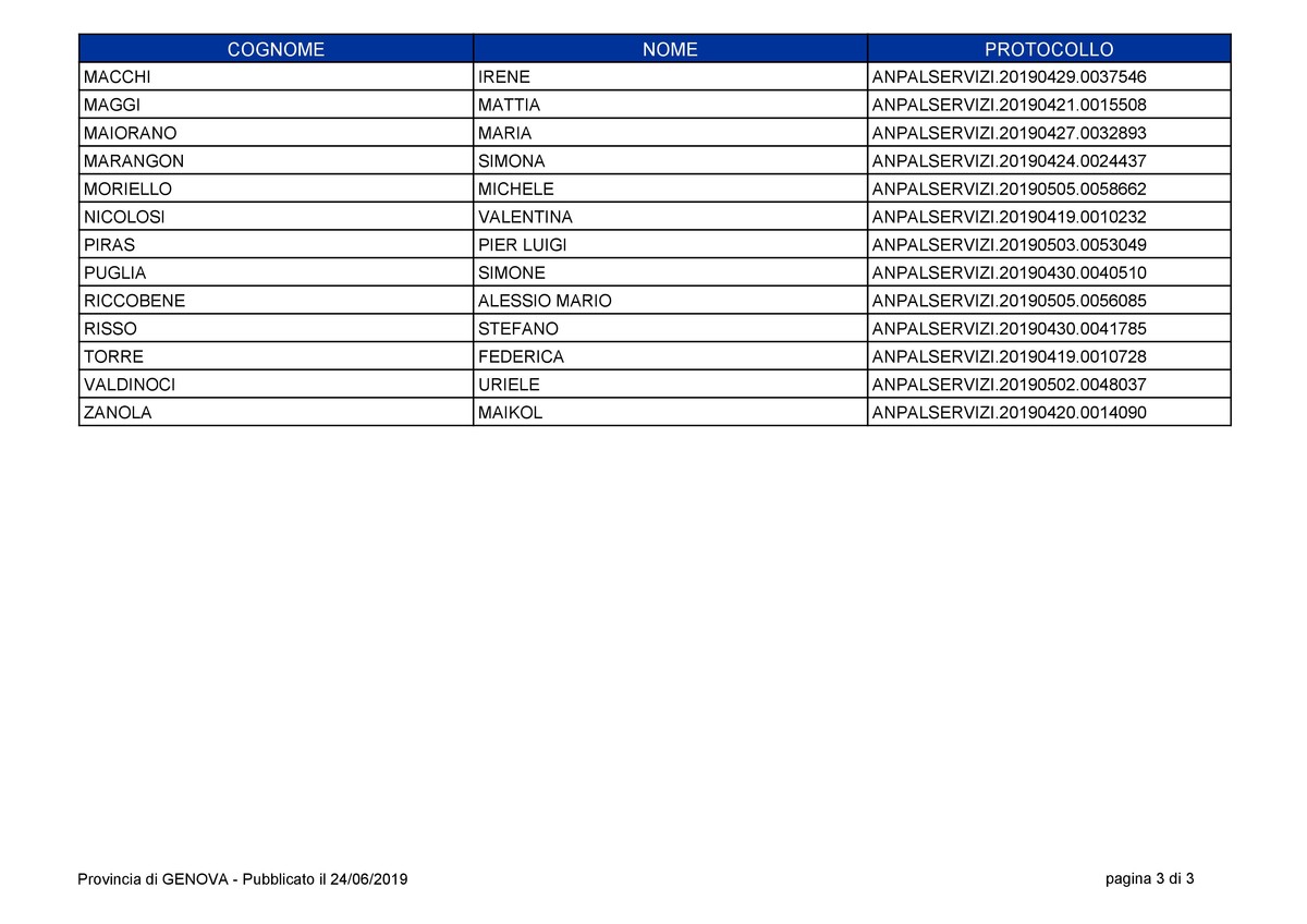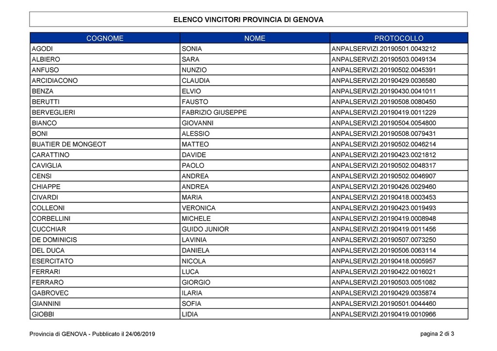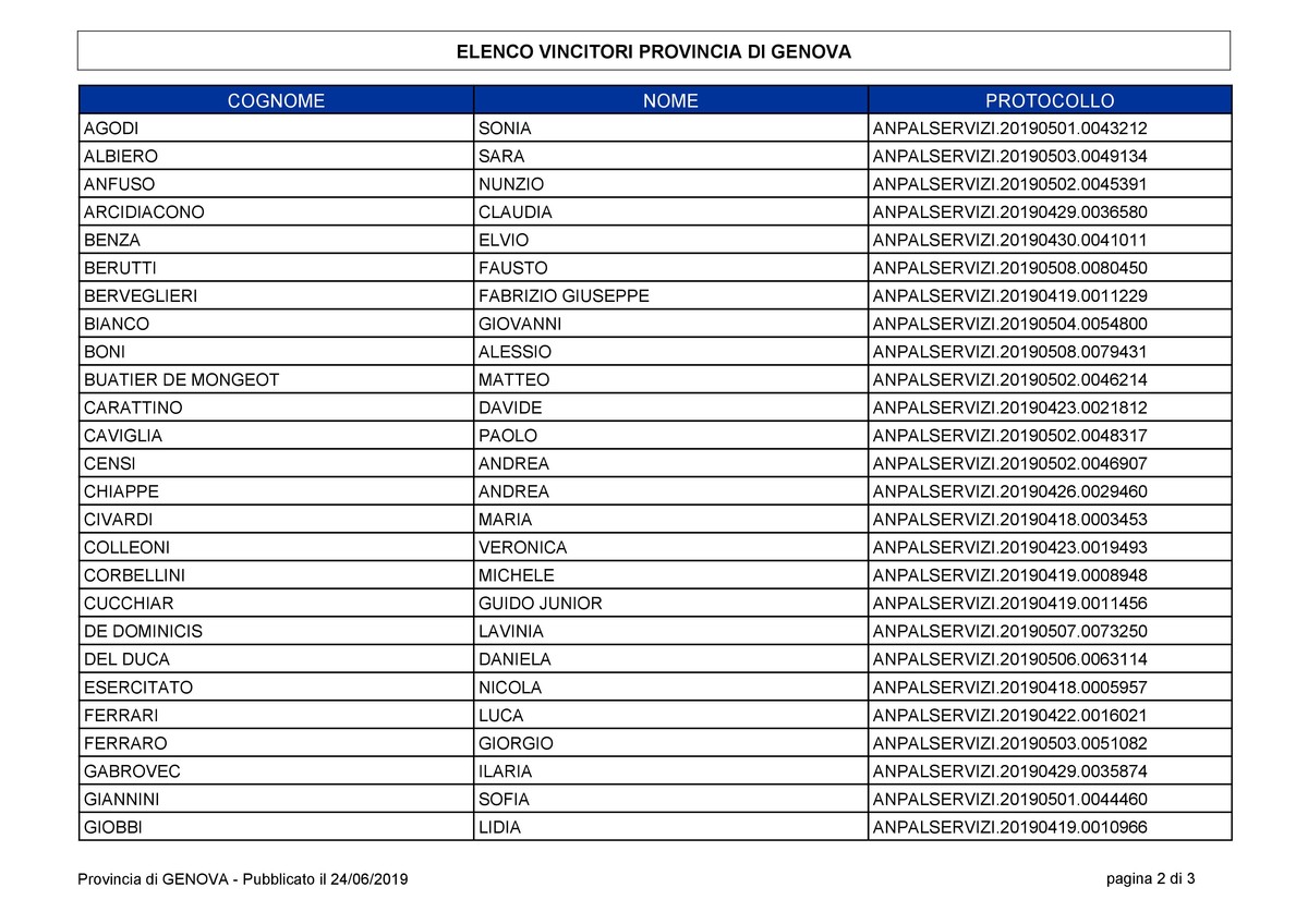 L’elenco riporta un numero di candidati a partire dal primo della graduatoria, fino al numero dei posti disponibili previsti dall’Avviso, per la provincia di GENOVA