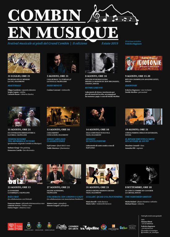 Ci saranno alcuni concerti in alta quota, presso il rifugio Letey di Champillon, con una performance molto particolare tra la poesia e la musica, giocando con parole e suoni, o alla Conca di By, presso la casa Farinet, dove ci si muoverà tra i secoli accompagnati da flauto e fisarmonica e potrà essere anche occasione di visitare il bacino di By CVA.