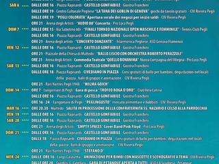 Ma ecco il programma nel dettaglio: dalle 16 alle 24, sul lungomare di Pegli, ecco ‘Peglingusto’, ovvero un mercato alimentare con hobbisti, artigianato e banchi di qualità; quindi, dalle 18, in largo Calasetta, dj set a cura di Jacopo Saliani ed esibizione di ginnastica ritmica e artistica a cura del gruppo sportivo dilettantistico Regina Margherita; a seguire, dalle 21,30, esibizione da parte dell’associazione sportiva dilettantistica Mivida Latina - U.S.S. San Marziano.
