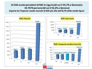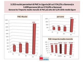 In provincia di Genova dall'erogazione del Reddito sono coinvolti 8868 nuclei familiari, per un totale di 18433 persone: l'importo mensile erogato mediamente si attesta sui 479,85 euro. Per la Pensione di cittadinanza invece ammontano a 1818 i nuclei familiari interessati, per un totale di 1991 persone coinvolte, a cui sono andai mediamente importi pari a 217,49 euro.