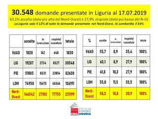 In totale in Liguria le persone coinvolte dalle misure di sostegno al reddito sono 38373, invece l’importo mensile medio percepito è di 444,77 euro a individuo (dietro solo ai 458,41 euro della Lombardia nel Nord Ovest). Sono state accolte il 63,1% del totale delle domande presentate, una percentuale che è la più alta di tutto il Nord Ovest sono state invece respinte richieste per il 27,9%.