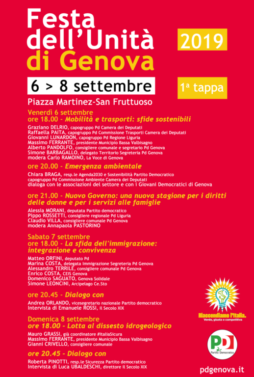 È tutto pronto in piazza Martinez per l’edizione 2019 della Festa dell’Unità di Genova. Appuntamento da venerdì 6 a domenica 8 settembre con la prima tappa della “settembrata”, che proseguirà poi dal 20 al 22 settembre in piazza Sciesa a Pra’.