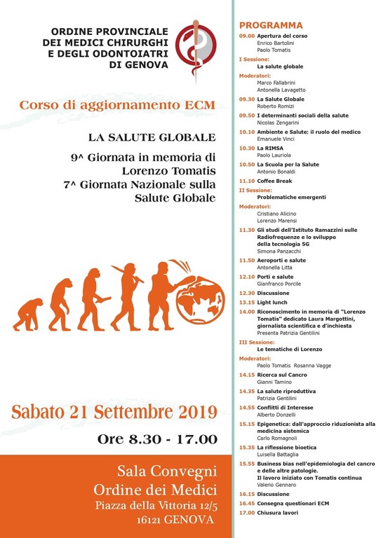 È in programma sabato prossimo, 21 settembre, a Genova un convegno nazionale dal titolo “La Salute Globale” organizzato dall’Ordine dei medici e degli odontoiatri di Genova in collaborazione con l’Associazione Italiana Medici per l’Ambiente e con la Federazione Nazionale degli Ordine dei Medici.