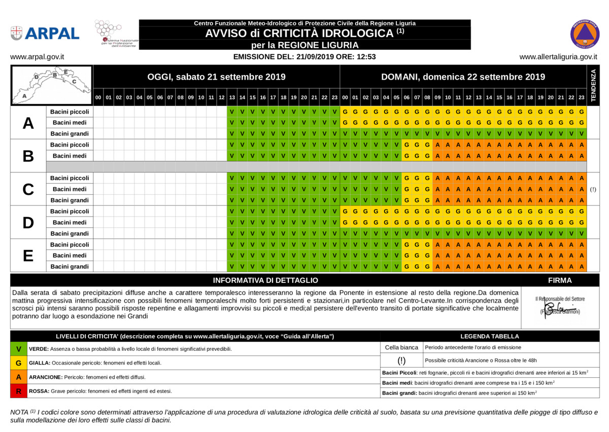 - costa centrale (zona B), levante (zona C) e interno di centro levante (zona E): GIALLA dalle 06 alle 09 di domenica 22 settembre, poi ARANCIONE fino a mezzanotte.