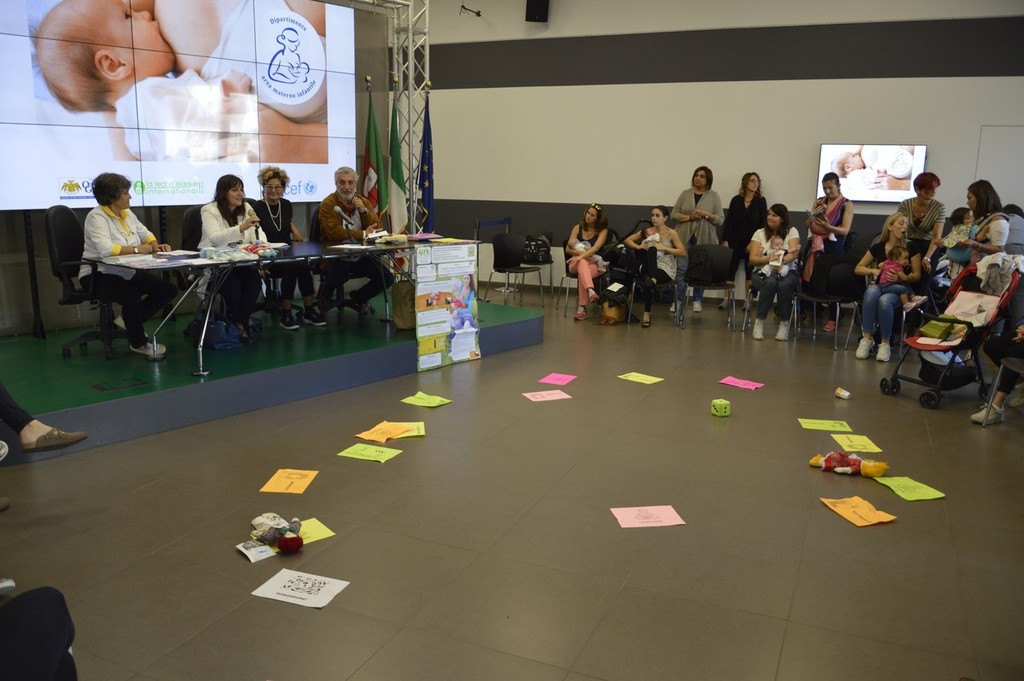 I genitori che hanno partecipato all'iniziativa organizzata questa mattina in Regione hanno giocato con un gioco dell'oca gigante dedicato ai temi dell'allattamento.