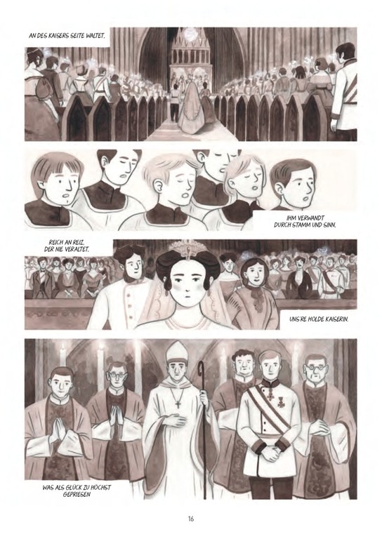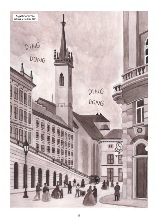 L’importante per me era scrivere la storia, mentre la parte grafica è stata fatta in sua funzione. Volevo raccontare una vicenda difficile, da certi punti di vista anche violenta, ma volevo farlo con delicatezza, per cui ho cercato uno stile grafico adatto. Inoltre volevo scollegarmi dai film degli anni Cinquanta con Romi Schneider: la mia Sissi non assomiglia per niente a lei, e anche per quanto riguarda gli altri personaggi storici, come l’Imperatore Francesco Giuseppe, ho cercato di dare la mia chiave di lettura, disegnandoli alla mia maniera.