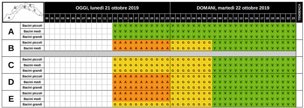 CENTRO PONENTE E BACINI PADANI DI LEVANTE (ZONE B, D, E) ARANCIONE DALLE 13 FINO ALLA MEZZANOTTE DI OGGI, POI GIALLA FINO ALLE 8 DI DOMANI MARTEDI’ 22 OTTOBRE
