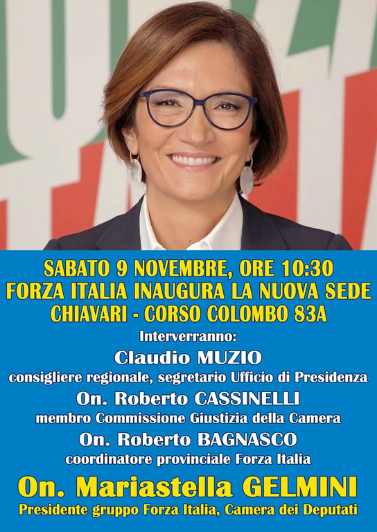 Sarà l’onorevole Mariastella Gelmini, presidente del gruppo di Forza Italia alla Camera dei Deputati, ad inaugurare, sabato 9 novembre alle 10.30, la nuova sede del partito a Chiavari, situata in un ampio locale in Corso Colombo 83A.