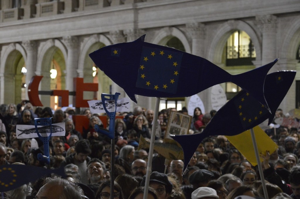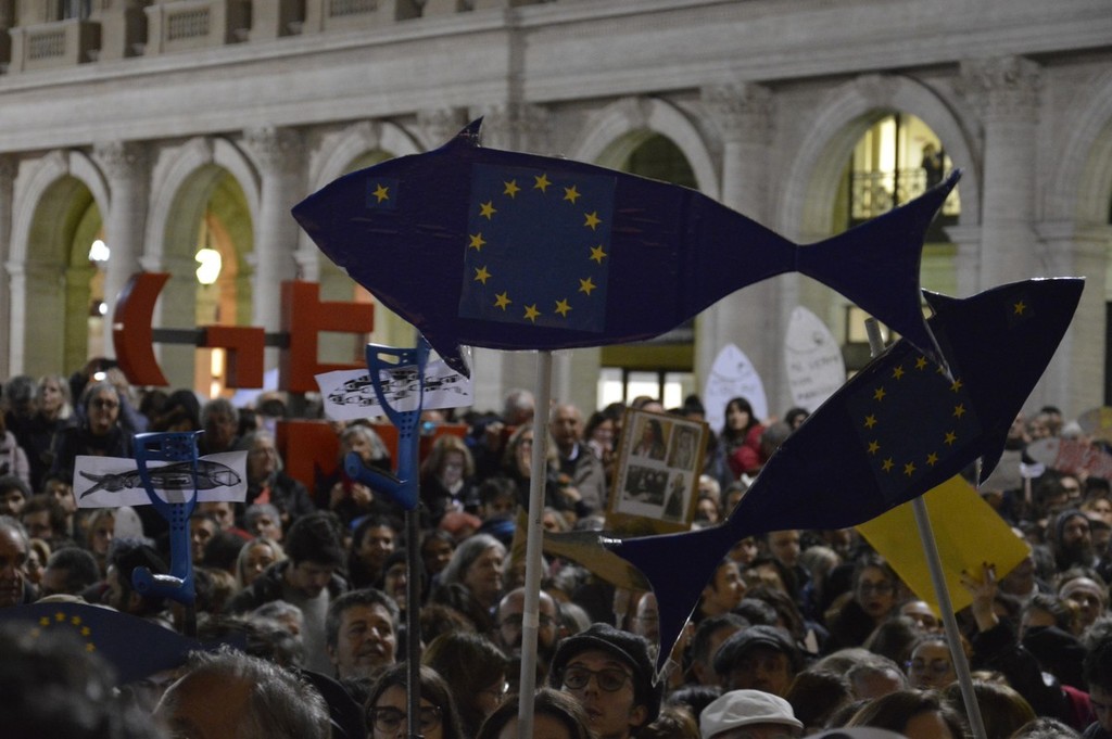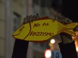 In migliaia a Genova rispondono all'appello nato in rete; tanti pesci di ogni colore e dimensione, striscioni e la piazza intona Bella Ciao