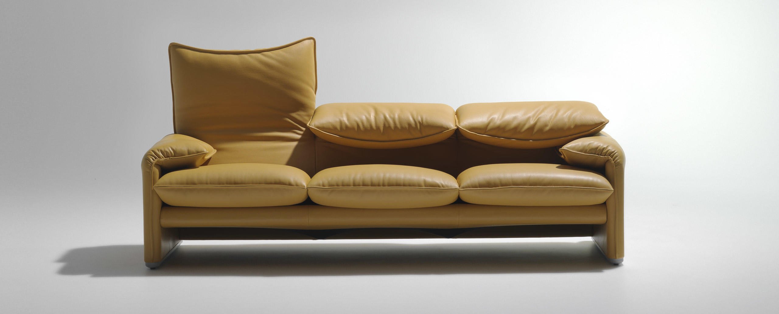 Progettato nel 1973 in una pelle beige, il divano è stato rinnovato al suo 40° anniversario con una cucitura a vista e sdrammatizzato da un tessuto sfoderabile, oggi disponibile in tre varianti di colore, dal nero al beige e grigio.