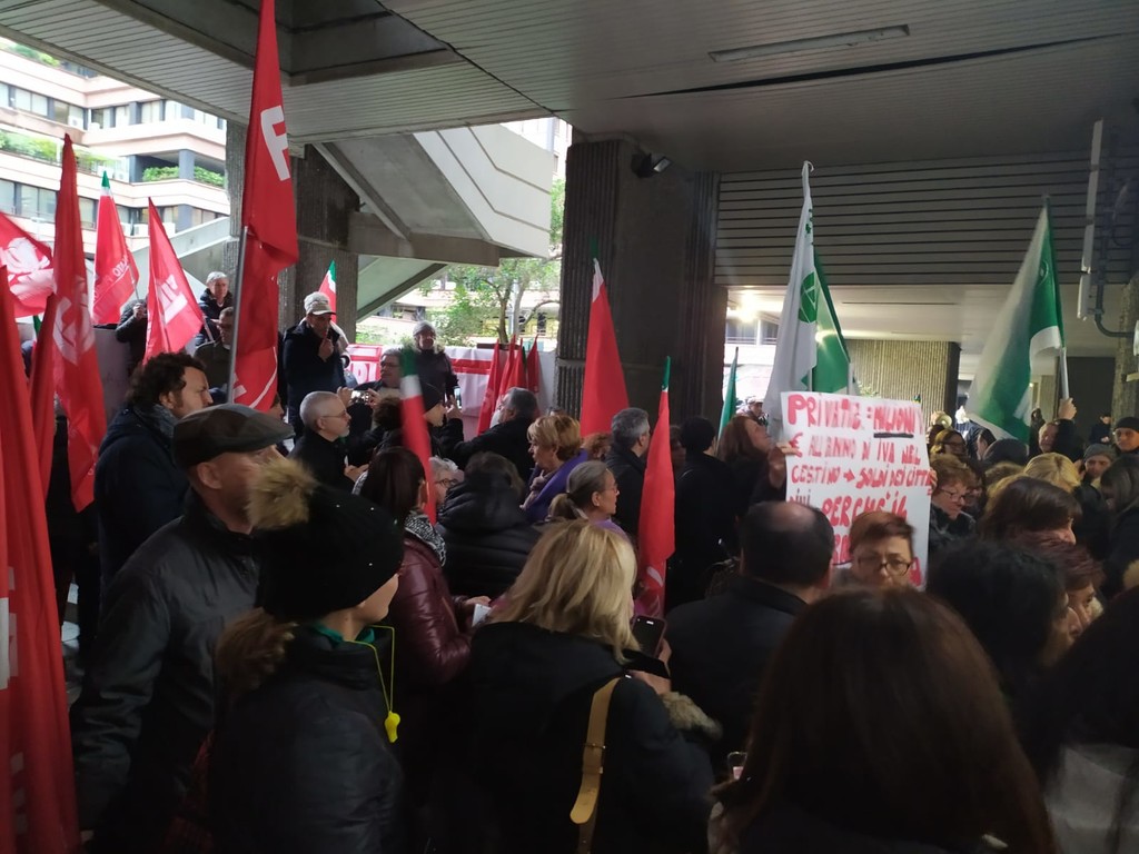 Presidio di un centinaio di sindacalisti e lavoratori del comparto sanità, principalmente della Cgil, questa mattina in Regione dove è in corso il consiglio regionale monotematico sul tema della sanità richiesto dalle minoranze.