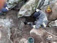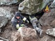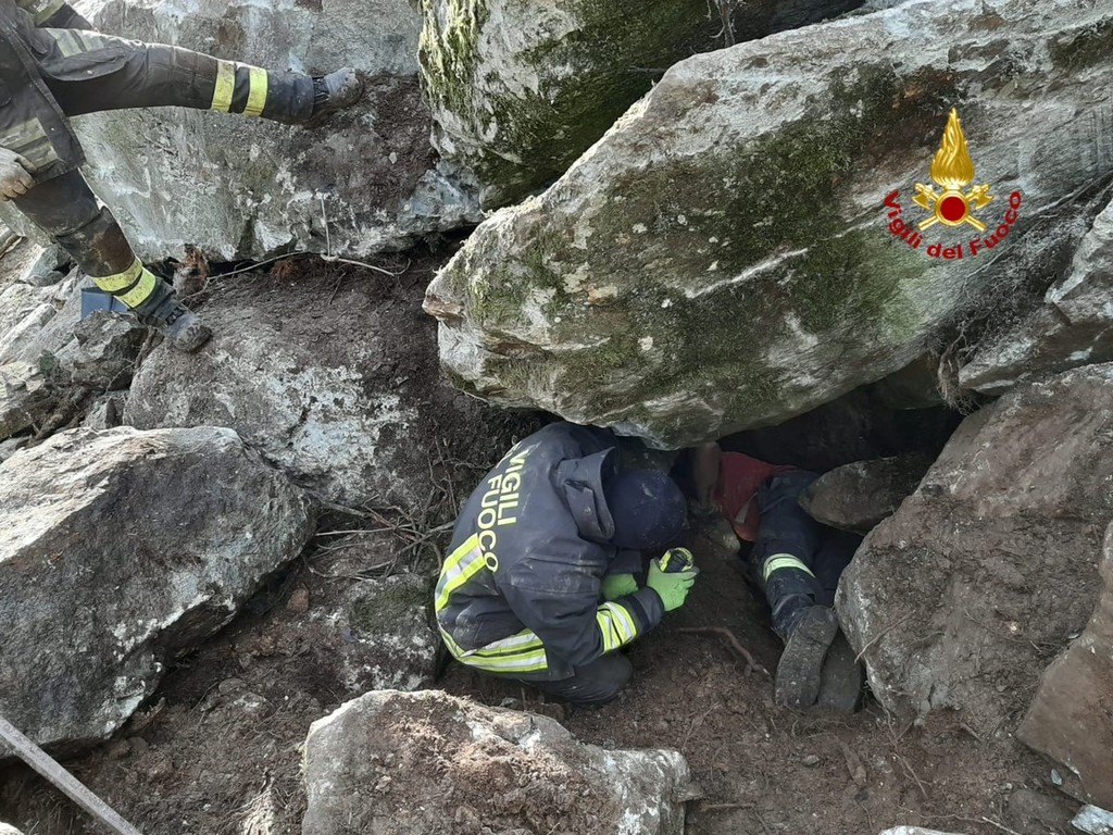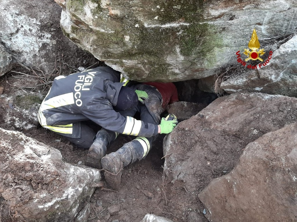 Cane da caccia intrappolato nella tana della preda: i pompieri spostano un masso con il paranco per salvarlo