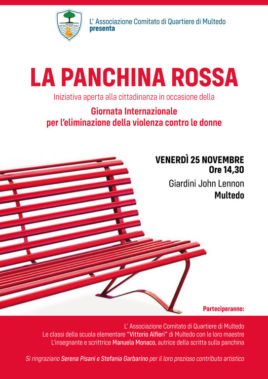 Laura Michelini, presidente del Comitato Pegli Bene Comune, afferma: “Insieme ad alcuni membri del Comitato Pegli Bene Comune e della Cooperativa Omnibus abbiamo dipinto la panchina rossa di Pegli. Per chi non lo sapesse, si tratta di un simbolo che ha come scopo invitare a riflettere tutti coloro i quali avranno occasione di sedersi proprio lì sul fatto che ci sono, purtroppo, moltissime donne che a causa di una morte per femminicidio non potranno più sostare su quella panchina. Non mancate all’inaugurazione”.