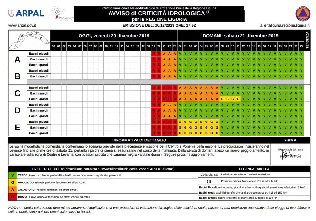 Per questo ARPAL HA PROLUNGATO L’ALLERTA METEO PER LA I BACINI GRANDI DELLA ZONA C che ora avrà questa scansione: ROSSA FINO ALLE 24, ARANCIONE FINO ALLE 8 DI DOMANI, SABATO 21 DICEMBRE, POI GIALLA FINO ALLE 12.