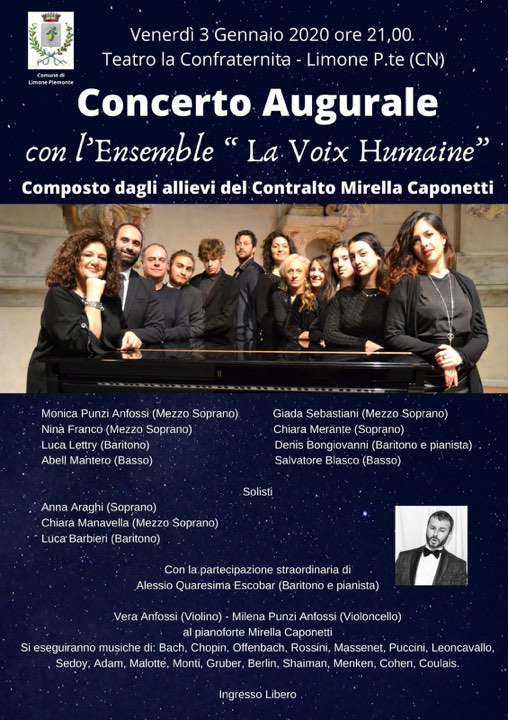 Venerdì 3 gennaio alle 21 al Teatro Alla Confraternita si terrà il Concerto di Natale con l’ensemble “La Voix Humaine”, composto dagli allievi del contralto Mirella Caponetti. Nella serata, che vedrà la straordinaria partecipazione del baritono e pianista Alessio Quaresima Escobar, si alterneranno brani natalizi, celebri arie d’opera, operetta, musical, melodie e canzoni classiche.