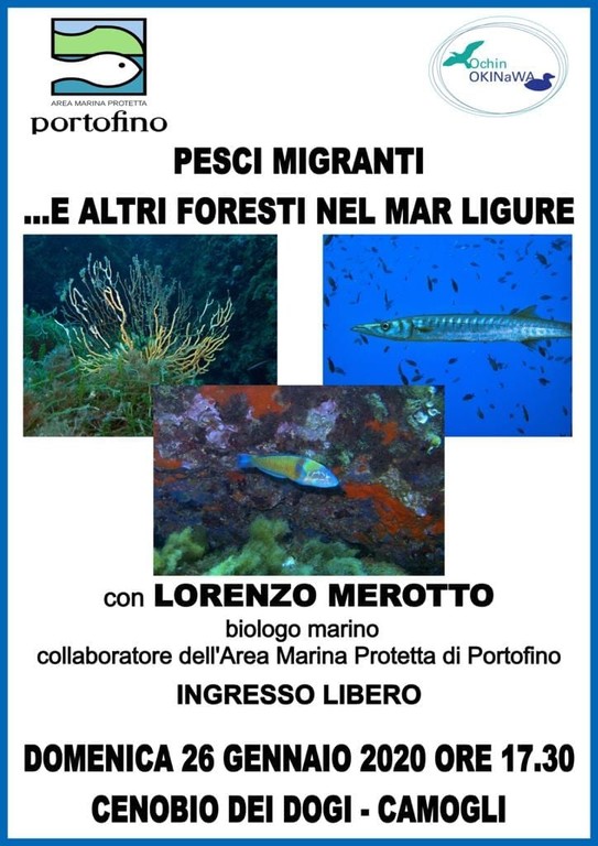 Di questi argomenti si parlerà oggi pomeriggio a Camogli alle 17.30 al Cenobio dei Dogi, nell’ambito dell’incontro intitolato ‘Pesci migranti… e altri foresti nel Mar Ligure’, organizzato dall’Area Marina Protetta di Portofino e dall’Associazione Ochin Ochinawa, a ingresso libero. Dei nuovi ‘abitanti’ del nostro mare ci parlerà Lorenzo Merotto, un giovane e brillante biologo marino, collaboratore dell’Area Protetta di Portofino. “I cambiamenti climatici - spiegano dall’associazione camogliese, che è una delle principali e più attive nel Borgo - sono un fenomeno globale, e sono ben visibili sulla terraferma. Ma lo sono ancora di più sott’acqua, anche se le conseguenze sono nascoste dal blu del mare. Quante sono le specie in arrivo da altri oceani e mari che vivono ormai tra di noi? Ne sono presenti anche di pericolose per gli animali autoctoni, umani compresi? Abbiamo invitato a parlarne Lorenzo Merotto, biologo marino, collaboratore dell’Area Marina Protetta di Portofino, che è in prima linea nello studio degli effetti climatici nel Mar Ligure, tra cui il monitoraggio di specie marine insolite, che, agevolate dalle alte temperature, sono diventate (o diventeranno) comuni anche dalle nostre parti, malgrado siano originarie di aree geografiche lontane. È un’occasione per conoscere alcune delle specie aliene o ‘foreste’ che popolano il nostro mar Ligure”.