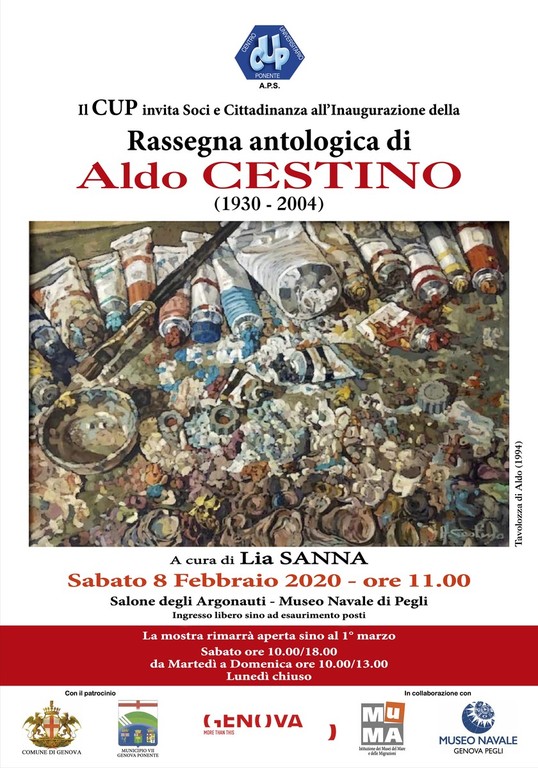 La mostra dedicata a Cestino sarà allestita presso il salone degli Argonauti del Museo Navale, l’inaugurazione è a ingresso libero. Apertura sino al prossimo 1° marzo, con questi orari: il sabato dalle 10 alle 18; dal martedì alla domenica dalle 10 alle 13. Lunedì giorno di chiusura. L’esposizione è realizzata dal Cup in collaborazione con il Mu.Ma, l’istituzione dei musei del mare e delle migrazioni (che comprende anche il Galata e la Commenda di Prè), e con il museo navale di Genova Pegli, e gode del patrocinio da parte del Comune di Genova e del Municipio VII Ponente. Il museo navale di Pegli ha sede nella prestigiosa villa Centurione Doria di Pegli, costruita nel 1540 da Adamo Centurione, ricchissimo banchiere. Attualmente ospita collezioni marittime relative a Genova e alle Riviere, che vanno dal XV al XIX secolo.