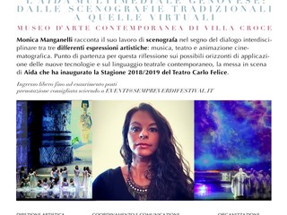 Il 9 febbraio a villa Croce, museo d’arte contemporanea, vedrà la partecipazione della scenografa Monica Manganelli, attiva nel teatro e nel cinema a livello internazionale; a Genova ha firmato più allestimenti tra cui l’Aida, opera che l'anno scorso ha inaugurato la stagione 2018/2019 del teatro Carlo Felice; Manganelli racconterà il suo lavoro nel segno del dialogo interdisciplinare tra le differenti espressioni artistiche: musica, teatro e animazione cinematografica.