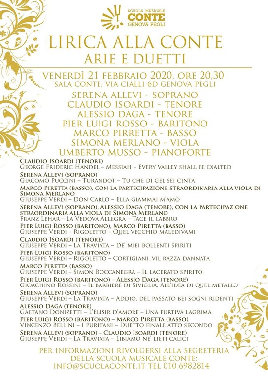 Si passerà così dall’Haendel del ‘Messiah’ al Puccini di ‘Turandot’, dal Lehar della ‘Vedova allegra’ al Rossini del ‘Barbiere di Siviglia’, dal Donizetti dell’‘Elisir d’amore’ al Bellini dei ‘Puritani’ e, infine, spazio al Verdi di ‘Traviata’, ‘Rigoletto’, ‘Don Carlo’ e del genovese ‘Simon Boccanegra’. Un excursus nel repertorio che include melodie note e meno conosciute, ma che ormai ci accompagnano da oltre un secolo e mezzo e che, per appassionati e non, sono in alcuni casi entrate ormai nel patrimonio ‘genetico’ della nostra epoca. Nelle arie e nei duetti si alterneranno quattro esecutori che annoverano già anni di carriera - Serena Allevi, soprano, Claudio Isoardi, tenore, Pier Luigi Rosso, baritono, e Marco Piretta, basso - e una giovane promessa, il tenore Alessio Daga; accompagnati al pianoforte da Umberto Musso, appassionato fautore di questo incontro.