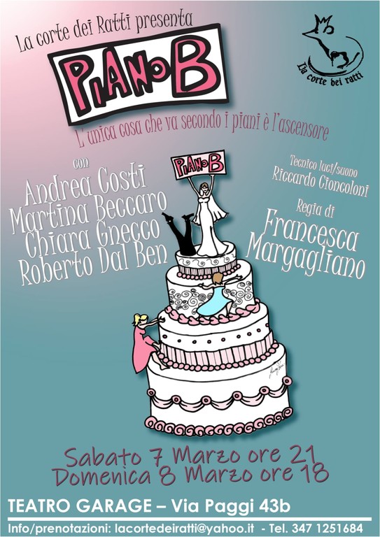 Sabato 7 e domenica 8 marzo La Corte dei Ratti porta in scena al Teatro Garage “Piano B - L’unica cosa che va secondo i piani è l’ascensore”, commedia brillante interpretata da Martina Beccaro Andrea Costi, Chiara Gnecco e con Roberto Dal Ben. Regia di Francesca Margagliano.