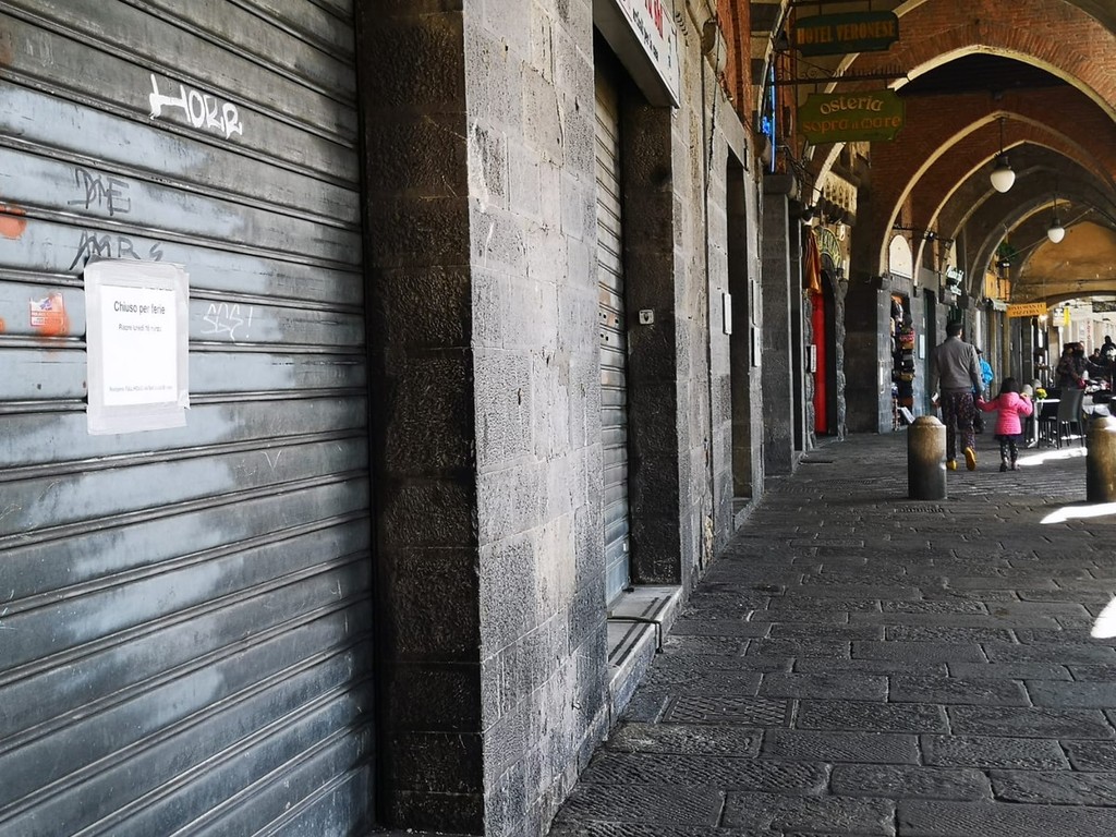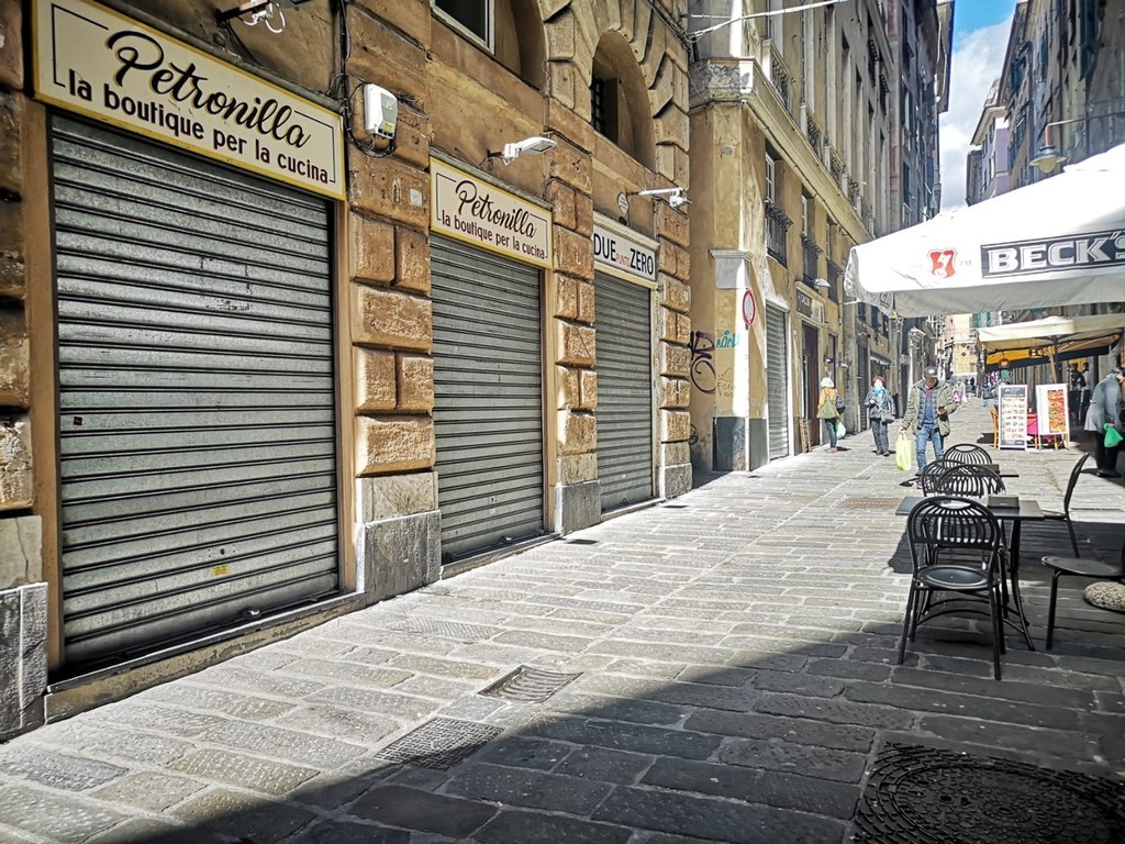 Per le vie del centro storico di Genova sono poche le persone e molti i negozi chiusi.