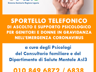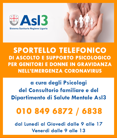 L'Asl3 di Genova ha attivato una nuova linea telefonica durante l’emergenza coronavirus, questa volta dedicata a genitori con figli in età scolare, oltre a donne in stato di gravidanza: si tratta di uno sportello telefonico d’ascolto e supporto psicologico a cura degli specialisti del consultorio della salute mentale di Asl3.