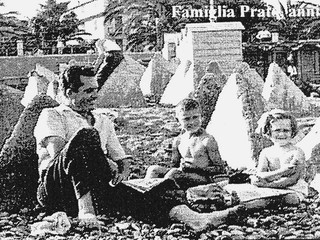 Spiaggia di Varazze anni ‘50, una famiglia posa per una foto dinnanzi ai blocchi di cemento, noti anche come “denti di drago”.