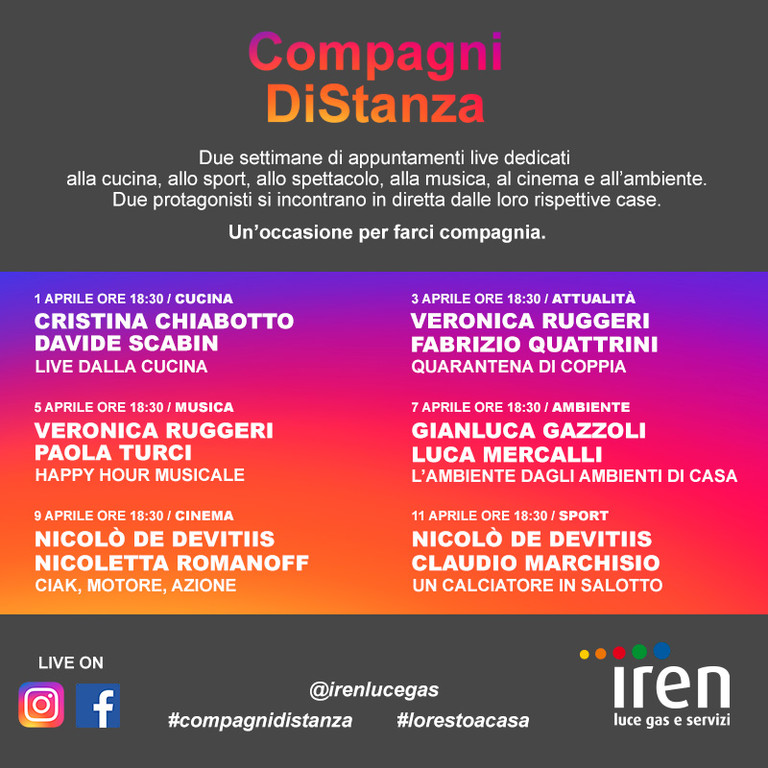 Il cibo, le relazioni affettive, la musica, l’ambiente, il cinema e lo sport. Saranno questi i temi di 6 appuntamenti tematici che Iren luce gas e servizi trasmetterà in diretta sui propri canali Facebook, @irenlucegas, e Instagram @irenlucegaseservizi. A parlarne saranno coppie d’eccezione: Cristina Chiabotto e Davide Scabin, Veronica Ruggieri con Fabrizio Quattrini e Paola Turci, Gianluca Gazzoli e Luca Mercalli, Nicolo De Vitis con Nicoletta Romanoff e Claudio Marchisio.
