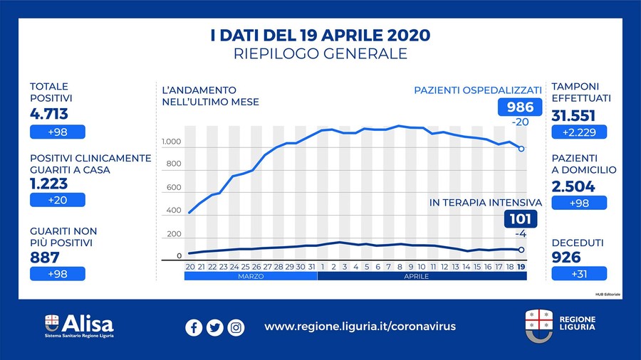 Sono 4.713 attualmente i positivi al Coronavirus (+98) in Liguria. 2.504 i pazienti a domicilio (+98) e 986 gli ospedalizzati (-20), di cui 101 in terapia intensiva (UTI, -49).