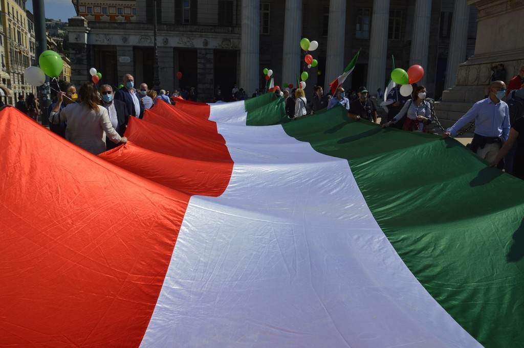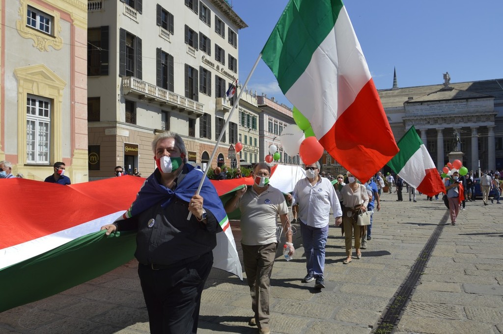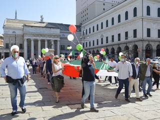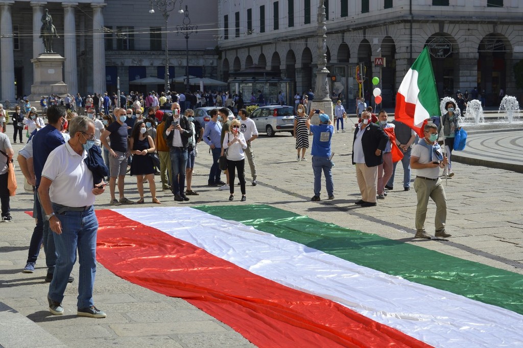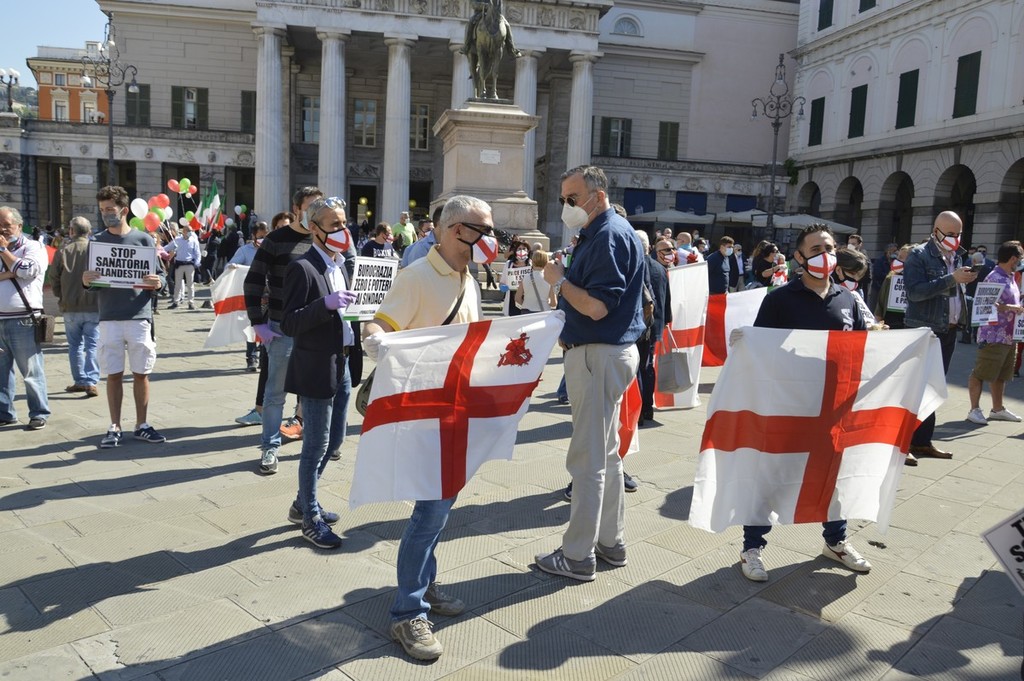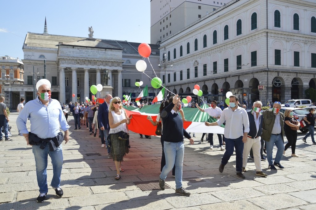 Forza Italia, Lega, Fratelli d'Italia e Cambiamo, ci sono tutte le formazioni della coalizione del centro destra in piazza De Ferrari, rappresentate da decine di militanti ma anche da numerosi esponenti a livello comunale, regionale e nazionale. Oltre alle immancabili bandiere italiane anche diversi cartelli che richiamano la sospensione delle cartelle del fisco per gli imprenditori in difficoltà, una riforma del sistema di tassazione, e lo stop alla sanatoria dei lavoratori migranti.