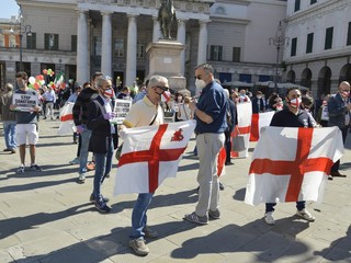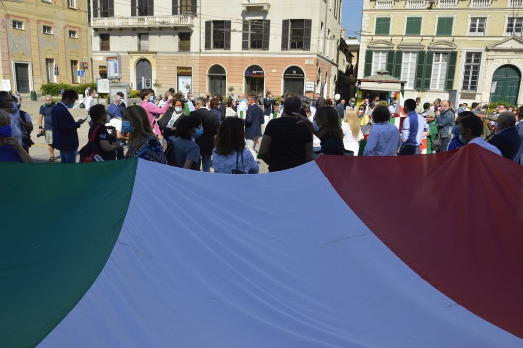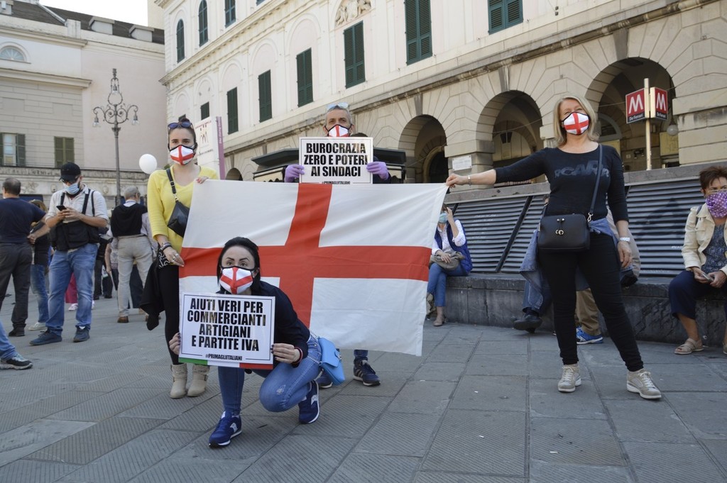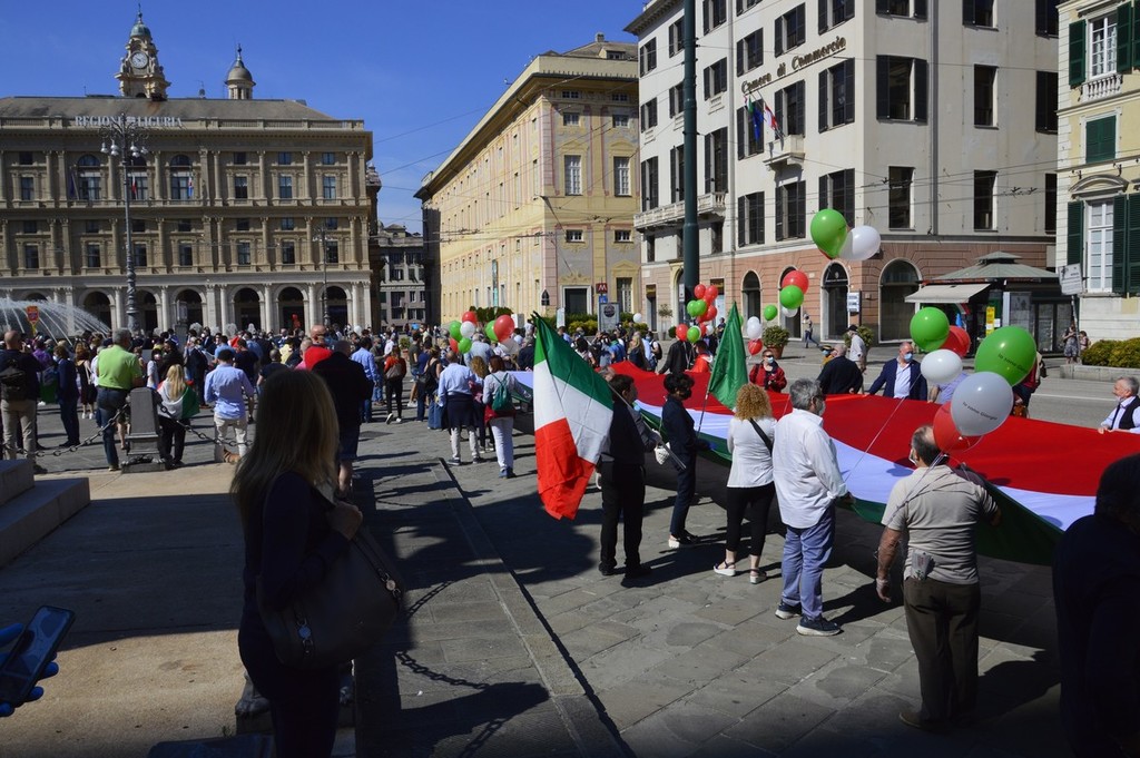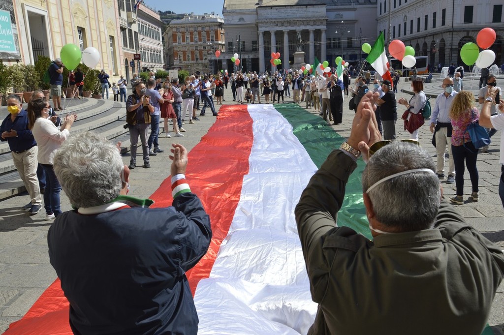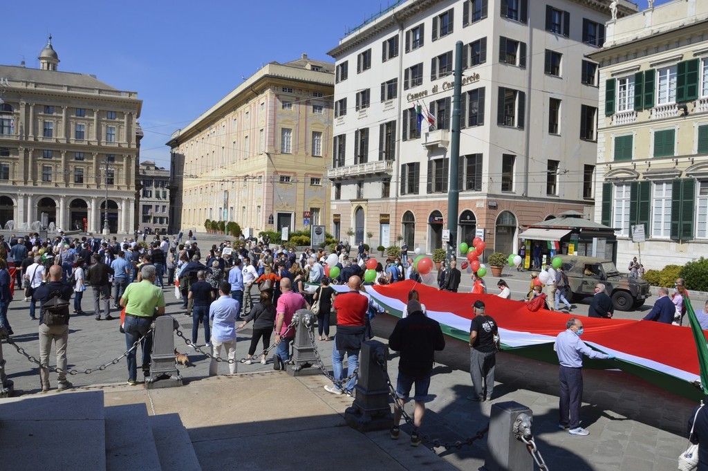 Forza Italia, Lega, Fratelli d'Italia e Cambiamo, ci sono tutte le formazioni della coalizione del centro destra in piazza De Ferrari, rappresentate da decine di militanti ma anche da numerosi esponenti a livello comunale, regionale e nazionale. Oltre alle immancabili bandiere italiane anche diversi cartelli che richiamano la sospensione delle cartelle del fisco per gli imprenditori in difficoltà, una riforma del sistema di tassazione, e lo stop alla sanatoria dei lavoratori migranti.