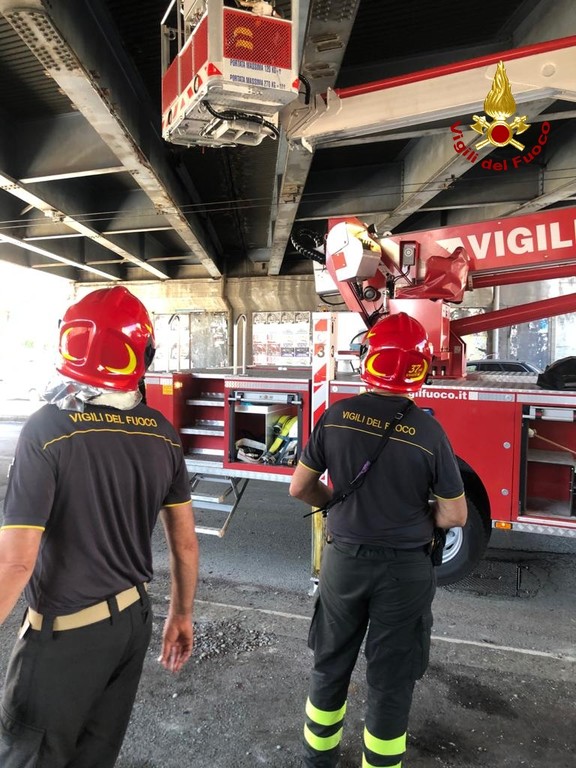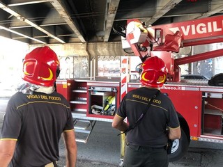 I vigili del fuoco stanno intervenendo in Via Cantore, a Sampierdarena, per la caduta di intonaco dal raccordo autostradale soprastante.