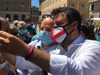 Dopo la mattinata trascorsa prima a Masone e poi al cantiere del nuovo Ponte di Genova, infatti, il segretario leghista è arrivato in piazza De Ferrari per partecipare alla conferenza stampa con Toti e Bucci e la senatrice Stefania Pucciarelli, e per salutare i militanti, anche se non sono mancate neanche le contestazioni durante i selfie.