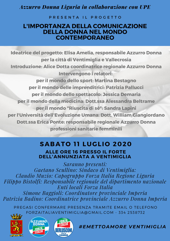 “L’importanza della comunicazione della donna nel mondo contemporaneo”. E’ questo il tema al centro del convegno che avrà luogo sabato 11 luglio alle ore 16.00 a Ventimiglia, presso il Forte dell’Annunziata. A promuovere l’evento sono Azzurro Donna Liguria (il movimento femminile di Forza Italia) e i coordinamenti regionale, provinciale e cittadino del partito, con la collaborazione dell’Università Popolare per l’Evoluzione Umana.