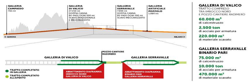 Sono state infatti completate due importanti opere in galleria: lo scavo del tratto di galleria di Valico che collega l’imbocco nord con il pozzo del cantiere Radimero e lo scavo del binario pari della Galleria naturale Serravalle.