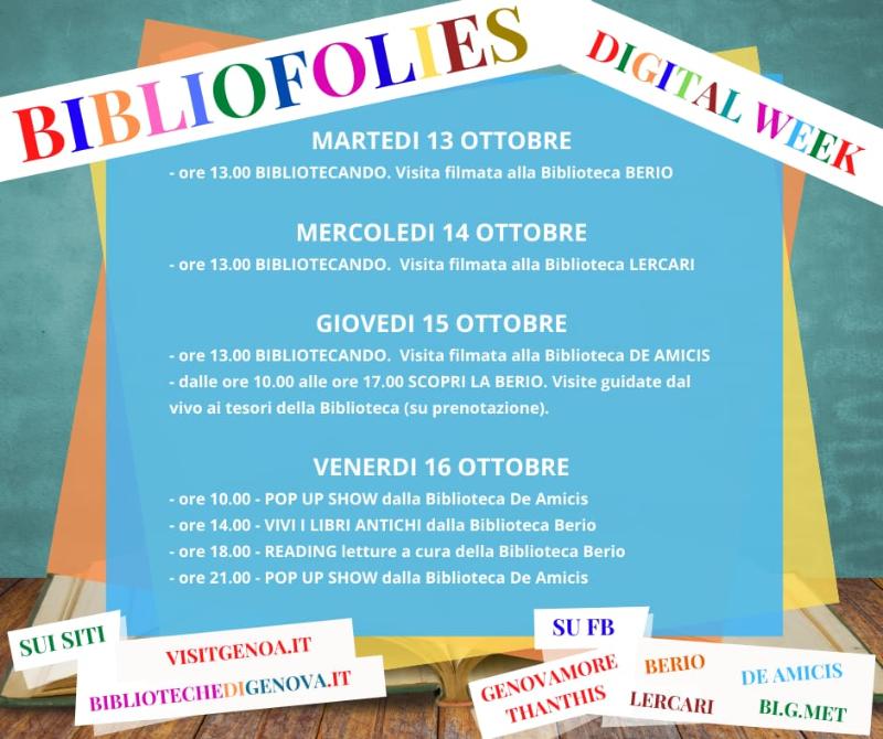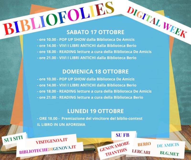Dal 14 al 18 ottobre avrà luogo la prima edizione di "Bibliofolies", un evento online e live dedicato alle biblioteche genovesi con visite guidate, presentazioni di libri rari, viaggi virtuali con filmati e reading realizzati da attori, questa prima edizione coinvolgerà le tre principali biblioteche di Genova: Berio, De Amicis e Lercari.
