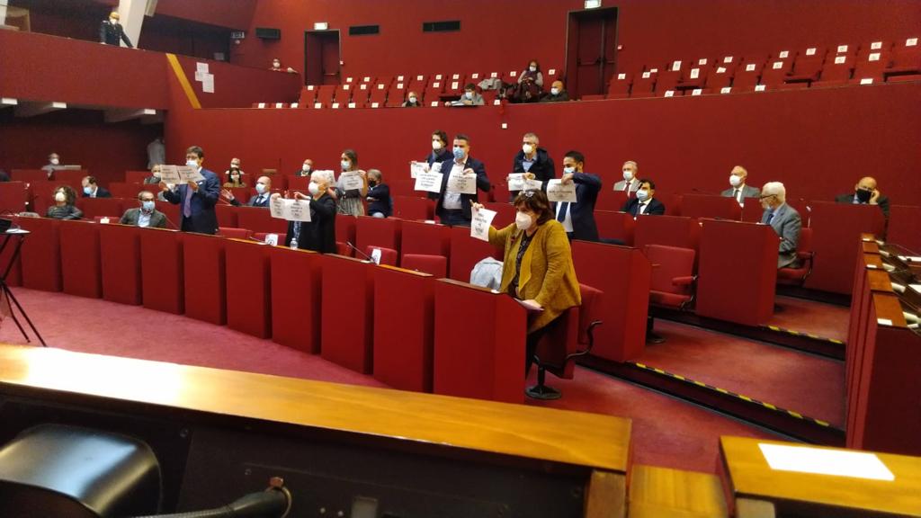 Si è tenuta nella sala rossa di palazzo Tursi, durante il consiglio comunale svolto nella giornata odierna, una protesta pacifica dei consiglieri e degli assessori comunali della Lega, che hanno esposto alcuni cartelli in sostegno dei medici e degli infermieri, delle attività economiche e della scuola. “Meno monopattini, più dottori”, “meno banchi a rotelle, più autobus”, “aiuti subito a ristoratori e baristi”, “chi opera in sicurezza non va chiuso”, alcune delle frasi contenute nei cartelli esposti.