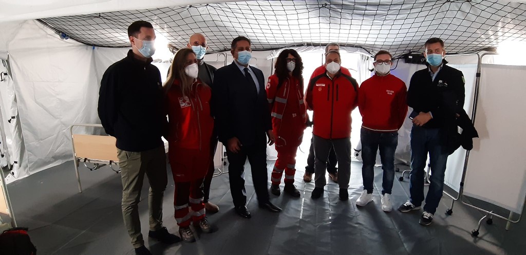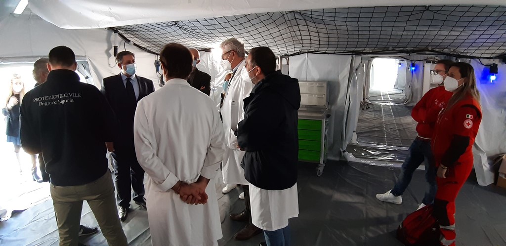 "Nel giro di due o tre giorni entrerà in funzione questo compound montato in tempo record dalla nostra Protezione Civile e dalla Croce Rossa, a supporto del pronto soccorso del Policlinico San Martino. Non sono letti aggiuntivi in senso tradizionale, cioè dove ricoveriamo in pianta stabile i pazienti: si tratta di 24 posti letto, che, dedicati a pazienti Covid, servono a garantire maggiore capacità di accoglienza al Pronto soccorso".
