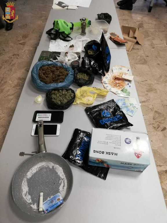 Trovati 17 involucri che contenevano 650 grammi di derivati della cannabis, 7 grammi di cocaina, 2 di ecstasy e 34 di ketamina nonché un bilancino di precisione, due telefoni cellulari e 1.350 euro