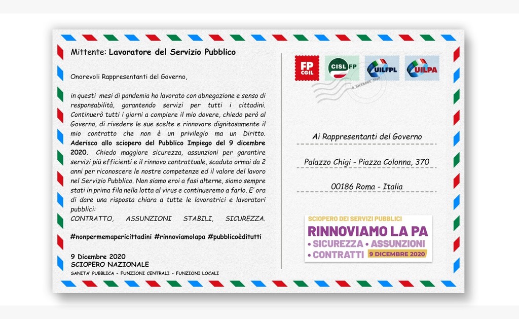 Messaggi accompagnati da una cartolina di ‘formale’ adesione, nella quale si legge: “In questi mesi di pandemia ho lavorato con abnegazione e senso di responsabilità, garantendo servizi per tutti i cittadini. Continuerò tutti i giorni a compiere il mio dovere, chiedo però al Governo, di rivedere le sue scelte e rinnovare dignitosamente il mio contratto che non è un privilegio ma un Diritto. Aderisco allo sciopero del pubblico impiego del 09 dicembre 2020.