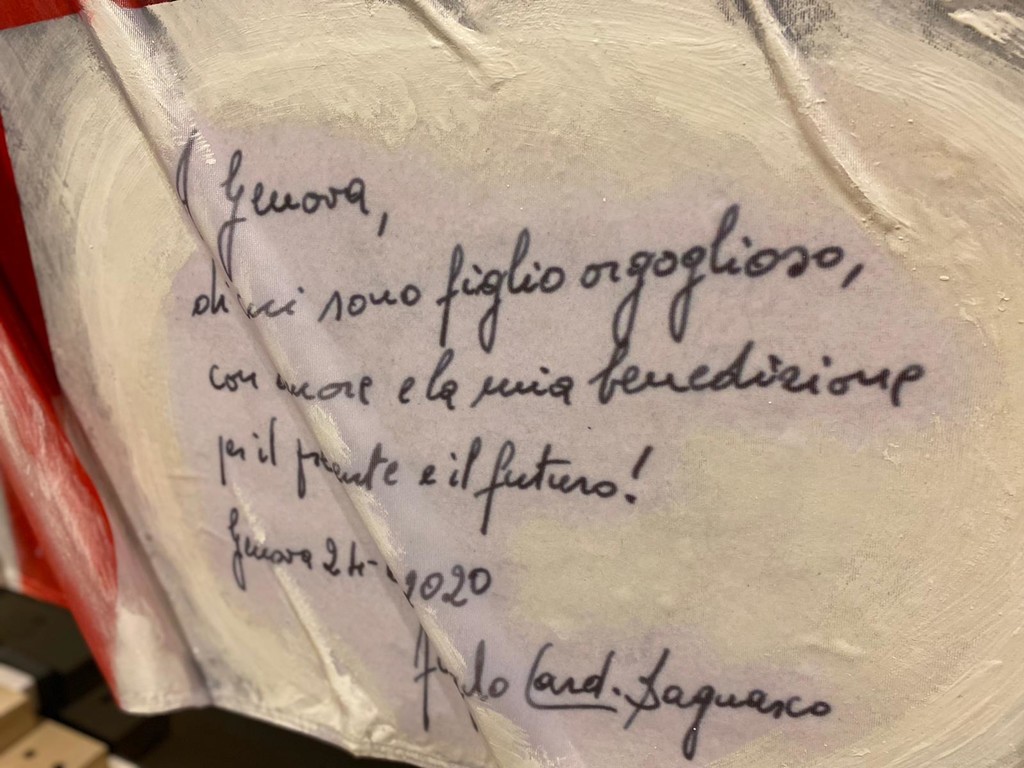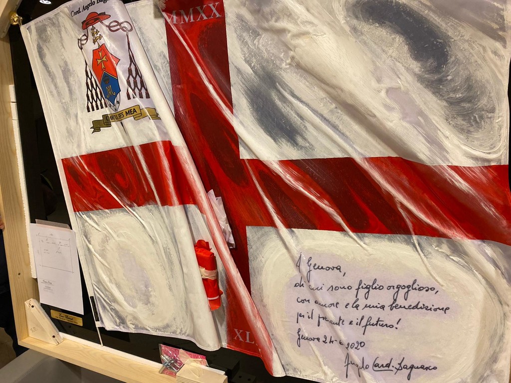Mentre la bandiera di San Giorgio, realizzata dall’artista Enzo Rotondo, riporta l’augurio dell’Arcivescovo Emerito Angelo Bagnasco di un futuro di pace e prosperità per “Genova, di cui sono figlio orgoglioso, con amore e la mia benedizione per il presente e il futuro”.