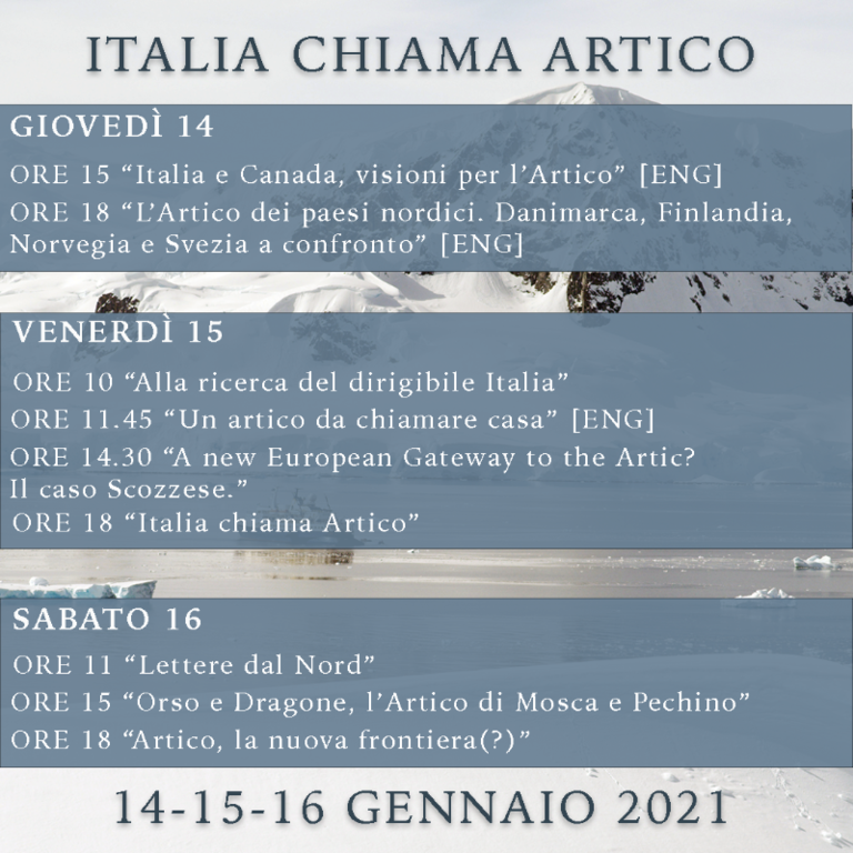 Che cosa sta succedendo al Polo Nord? Qual è la condizione ambientale della regione artica? È davvero possibile che scoppino conflitti per l’accaparramento delle immense risorse? Per rispondere a queste domande arriva il festival ‘Italia chiama Artico’, promosso dall’Osservatorio Artico che sarà libero e gratuito in live streaming sulle pagine facebook, linkedin e youtube del magazine, mira a raccontare gli aspetti ambientali, geopolitici, economici e sociali dell’Artico attuale, andando ad analizzare gli scenari del prossimo futuro.