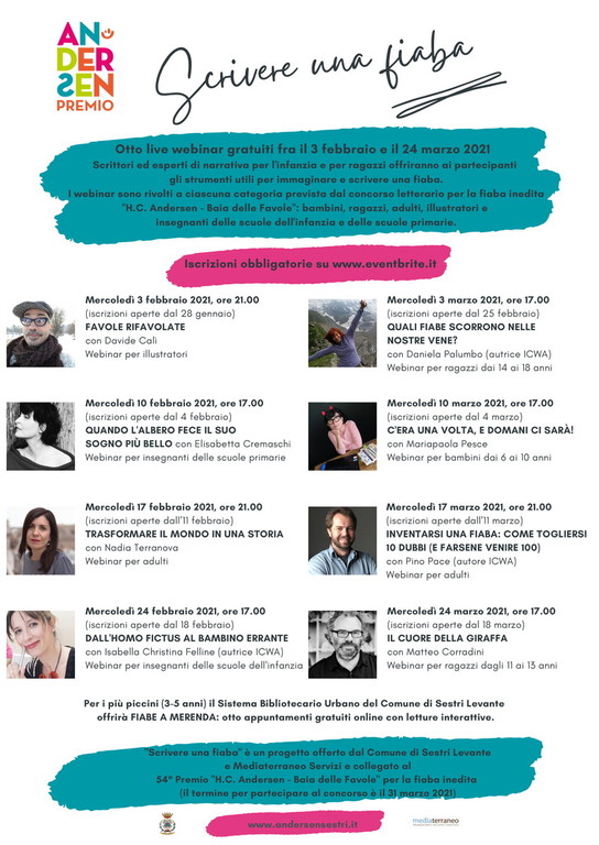 Il Premio Andersen è, per Sestri Levante, non solo un importante concorso per la fiaba inedita ma una parte di noi e del nostro patrimonio culturale che vogliamo mantenere viva e al passo con i tempi. Ecco quindi l’idea di “Scrivere una fiaba”: otto webinar gratuiti con grandi nomi della letteratura per l’infanzia e per ragazzi, che come Comune di Sestri Levante insieme a Mediaterraneo Servizi, siamo orgogliosi di poter offrire agli aspiranti scrittori di fiabe di ogni categoria prevista dal bando. Ringrazio gli autori e gli esperti che con entusiasmo hanno aderito all’iniziativa e il team di Andersen festival e premio che ha dato concretezza a un progetto così prestigioso in tempi rapidi".