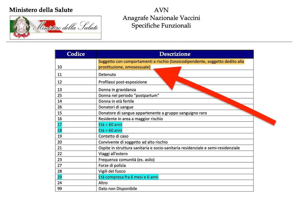 In merito, in una nota diramata dalla Regione, si legge: "A seguito di una prima indagine interna della Asl5 della Spezia, è emerso che la tabella utilizzata, con l’indicazione dei “soggetti con comportamenti a rischio” tra cui vengono indicati ‘omosessuali’, ‘tossicodipendenti’ e ‘soggetto dedito alla prostituzione’, è quella contenuta nelle linee guida attuali e vigenti che il ministero della Salute ha inviato alle Regioni e quindi alle Asl per tutte le vaccinazioni. Il documento, Anagrafe Nazionale Vaccini - Specifiche funzionali, è datato ottobre 2020.