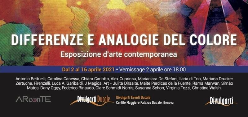 Ha preso avvio presso ‘Divulgarti Eventi Ducale’ nel cortile maggiore di Palazzo Ducale in piazza Matteotti la mostra d'arte ‘Differenze e analogie del colore’: la mostra, curata da Loredana Trestin con la collaborazione di Maria Cristina Bianchi, ideazione dell'Associazione ARconTE ed organizzazione di Divulgarti, rimarrà aperta fino al 16 aprile con opere d’artisti provenienti da diverse parti del mondo.