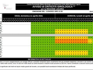 Arpal ha emanato la seguente allerta meteo per gli effetti delle piogge diffuse e dei temporali sul centro levante regionale da mezzanotte alle 15 del 12 aprile: