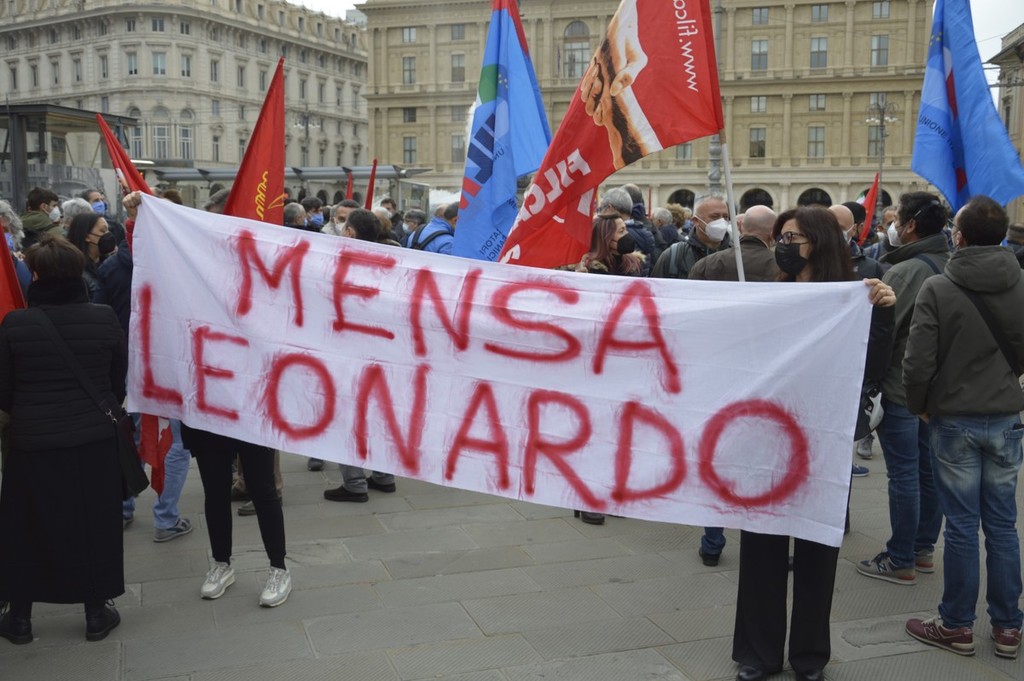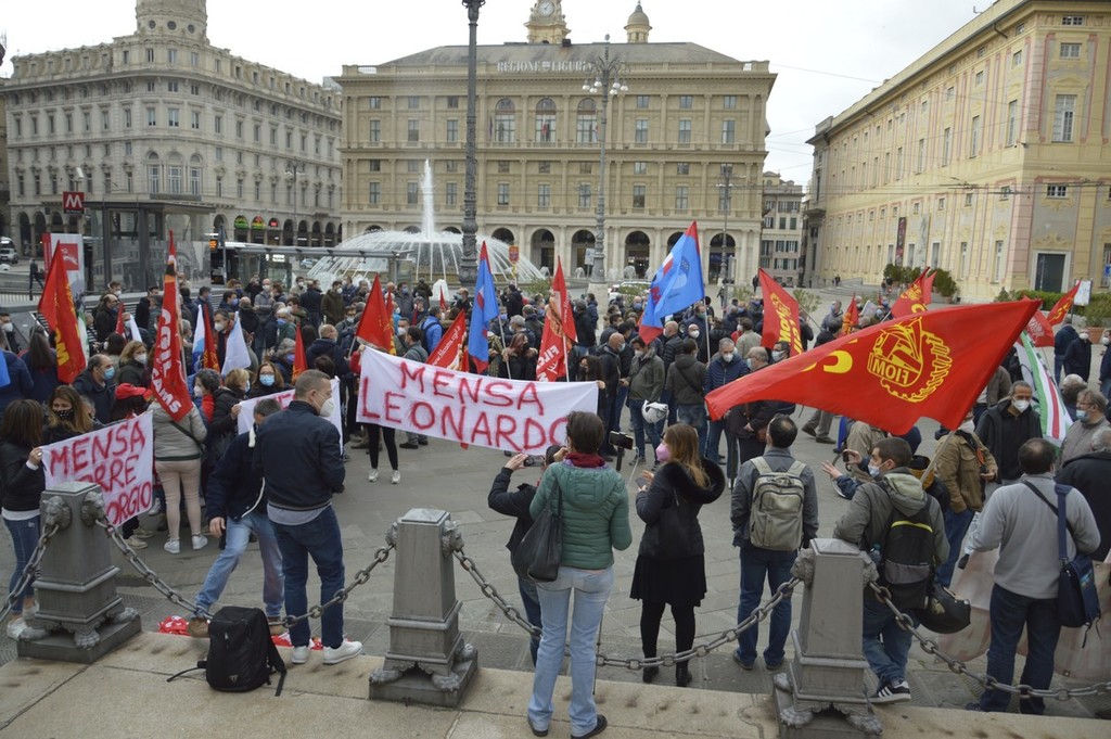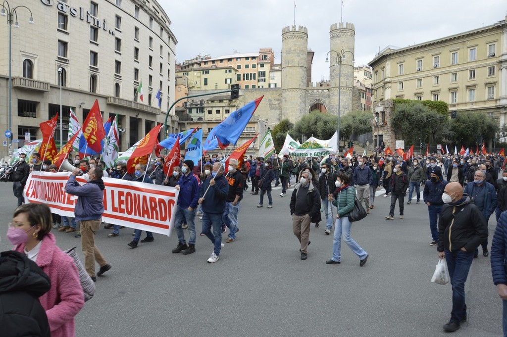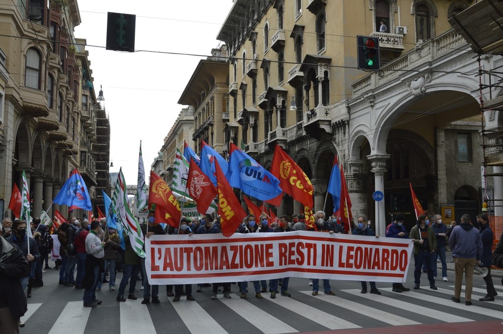 I lavoratori di Leonardo oggi in piazza con Fim, Fiom e Uilm per rivendicare che il reparto Automazione,400 persone impiegate nell'area genovese, rimanga all’interno del gruppo.
