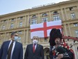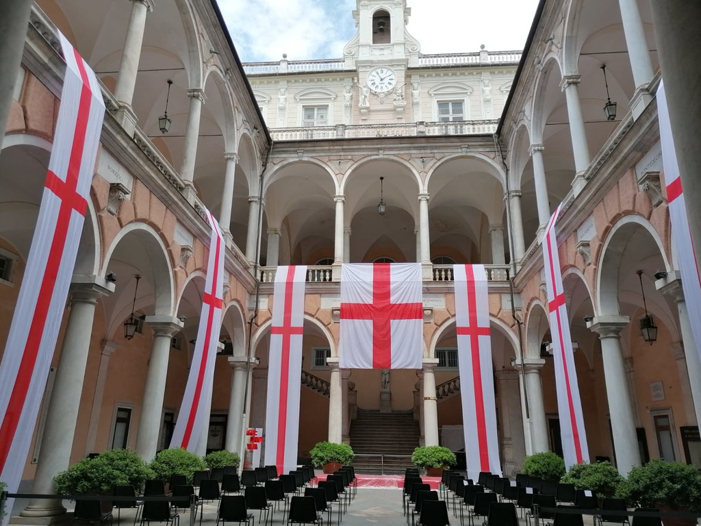 In vista della cerimonia, che si terrà alle 11, il cortile di Palazzo Tursi è stato allestito con 6 stendardi e un bandierone centrale, che scendono dal loggiato.