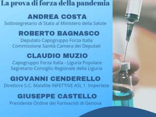 Interverranno sul tema "Prima Vaccinare". La prova di forza della pandemia" il Sottosegretario di Stato al Ministero della Salute Andrea Costa, il Deputato Capogruppo di Forza Italia nella Commissione Sanità della Camera dei Roberto Bagnasco, il Capogruppo di Forza Italia - Liguria Popolare e Segretario del Consiglio Regionale della Liguria Claudio Muzio, il Direttore della Struttura Complessa Malattie Infettive dell'ASL 1 Imperiese Giovanni Cenderello e il Presidente dell'Ordine dei Farmacisti di Genova Giuseppe Castello.
