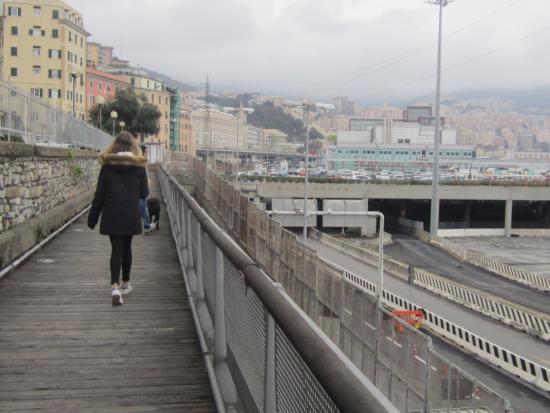 Nei giorni scorsi è avvenuto il cambio di proprietà della passeggiata panoramica dall’Agenzia del demanio al comune di Genova. Il passaggio non è solamente una questione di carattere formale, poiché consente al Comune di ottenere la piena gestione dell’intero complesso, naturalmente fatta salva l’operatività ai fini della sicurezza per la navigazione, che resta appannaggio della Marina militare. Dalla passeggiata sospesa in legno e acciaio si gode uno straordinario panorama del porto. Nata nel 2001, da vent’anni a questa parte costituisce una forte attrattiva nei confronti di un pubblico anagraficamente trasversale, dai più giovani fino alle persone di età più avanzata. Una finestra sulla città che ha pochi eguali, forse Spianata Castelletto e poco altro.